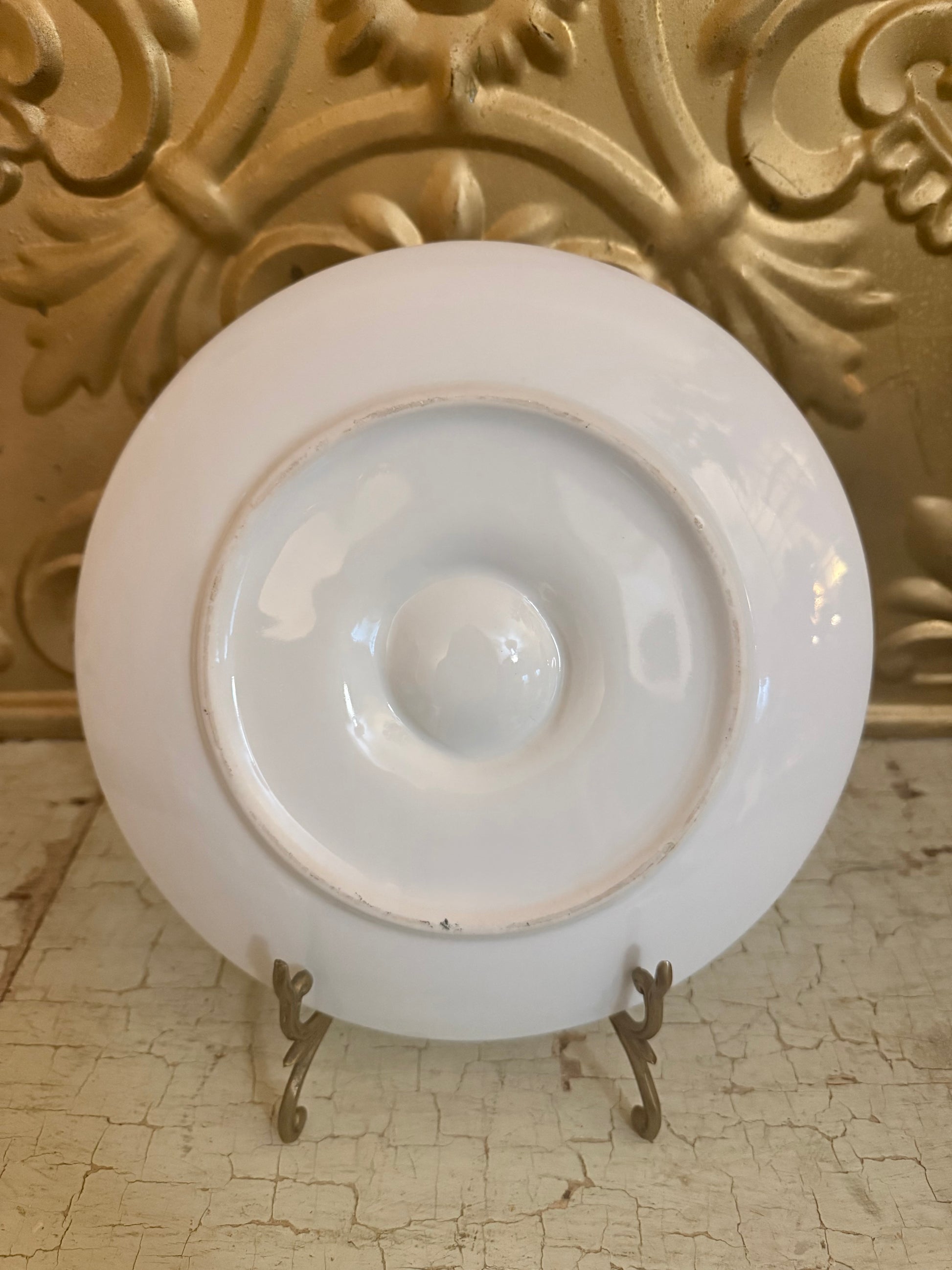 A timeless vintage white oyster plate featuring six deep oyster wells surrounding a central sauce reservoir.