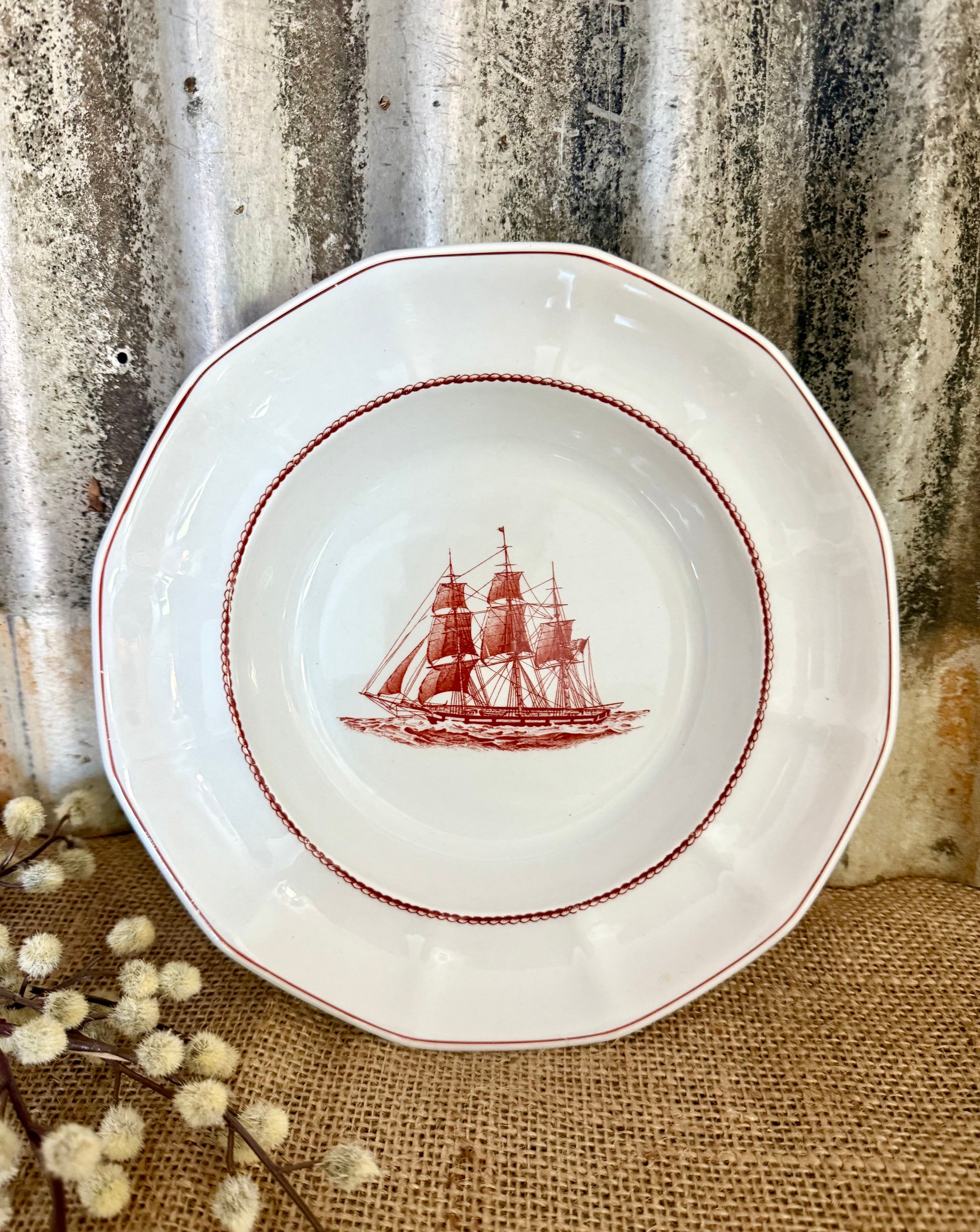 8 3/4" diameter, 1 1/2" deep. Red ship and rope design.