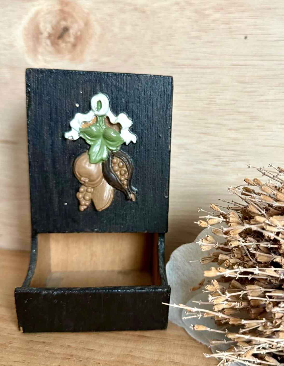 Vintage wooden match holder. 3" long, 5" tall, and 3" deep.
