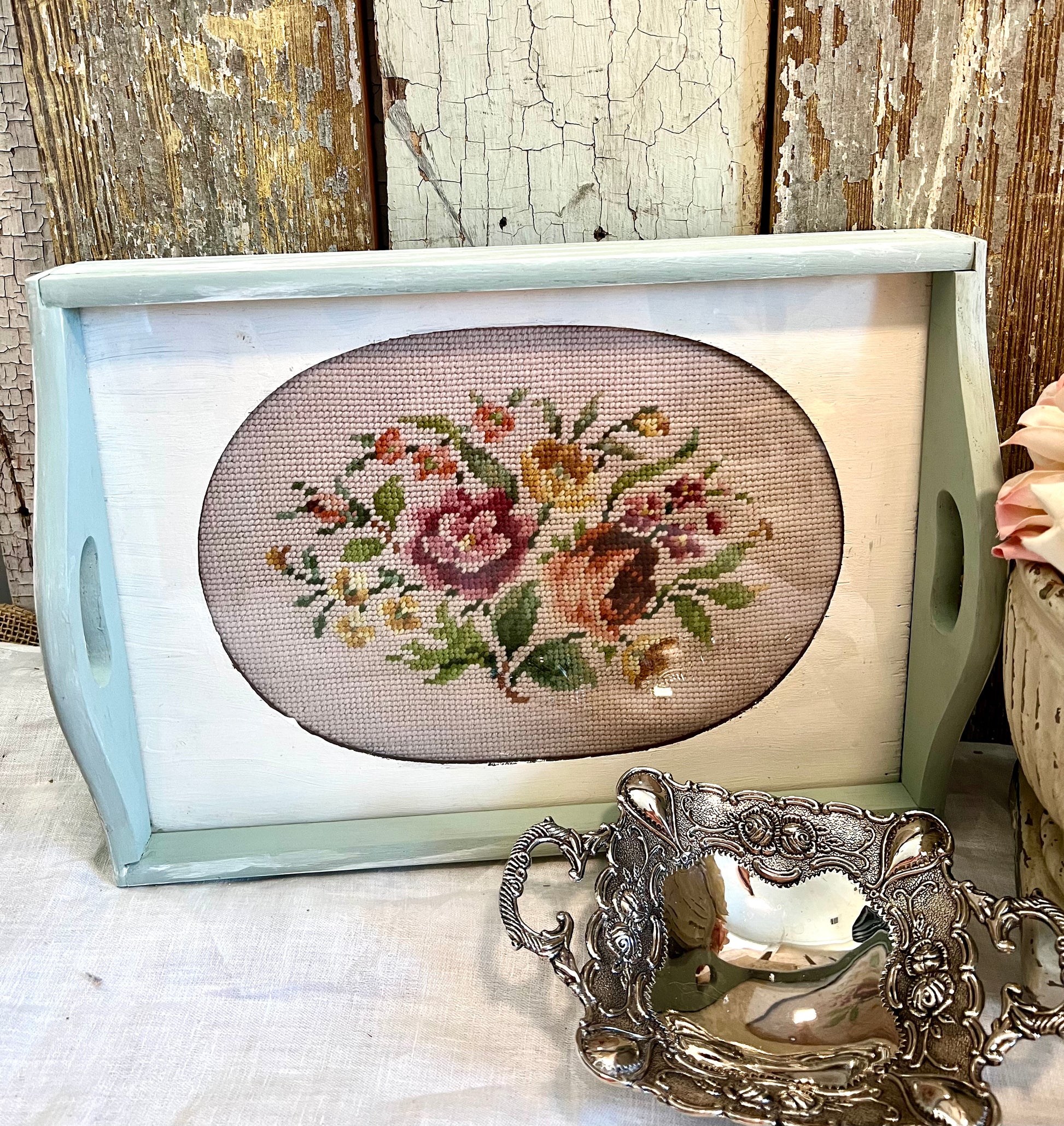 Robin's Egg blue distressed wooden tray with beautiful needlepoint insert. 10 1/2" x 14 3/4" x 1 3/4" Tray has a glass covering.